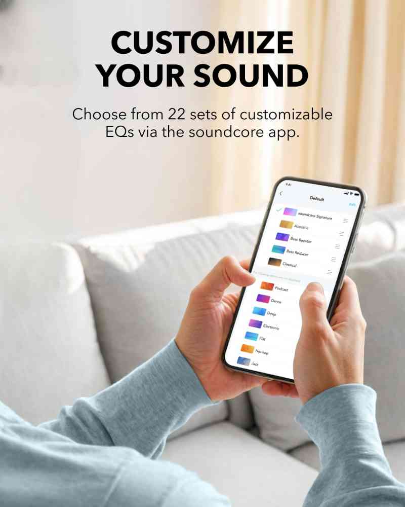 • Personalized Sound: With 22 preset EQ settings and customizable EQ options via the app, these semi-in-ear wireless earbuds let you sculpt your sound to fit your personal taste.
