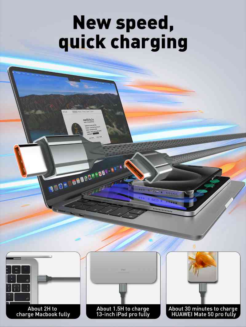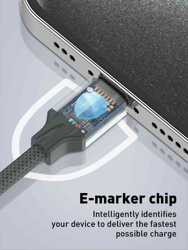 • Built-in E-Mark chip, automatically identifies the device for fast charging and ensures stable power, the maximum power reach 100W.