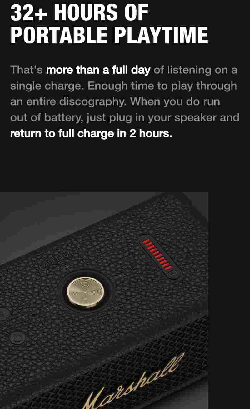 • Marshall Signature Sound: Features Marshall signature sound with Dynamic Loudness that adjusts the tonal balance of the audio to ensure your music sounds brilliant at every volume.