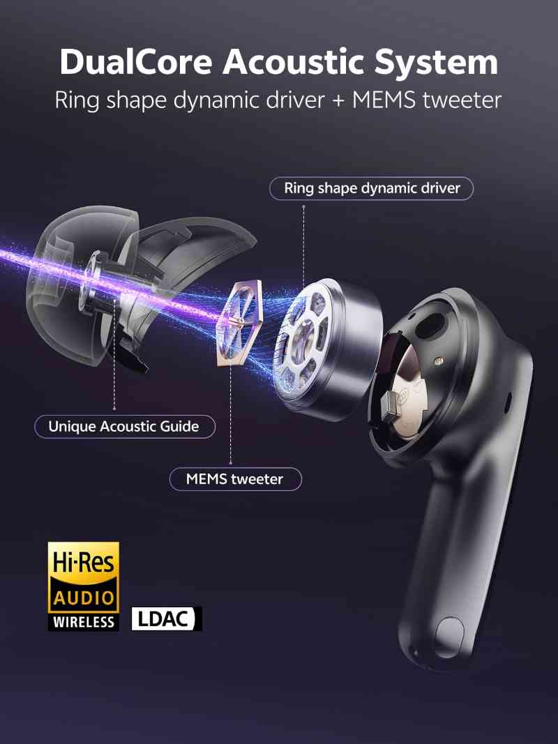 • DualCore Acoustic System with Hi-res Audio: The wireless earbuds combines customized ring shape dynamic driver and MEMS tweeter into a single earbud body, producing harmonized treble and bass for the ultimate sound quality. Hi-Res wireless audio and LDAC technology that transfers 3× more data than regular Bluetooth—bringing wireless music to life.