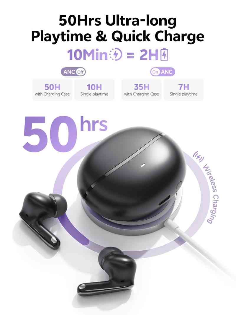 • 50H Playtime & Wireless Charging: Up to 10 hours of playback on a single charge and up to 50 hours with the case in normal mode. With ANC on, get 7 hours per charge and a total of 35 hours. Features fast charging (10-minute charge for 2-hour use) and wireless charging compatibility for ultimate convenience.
