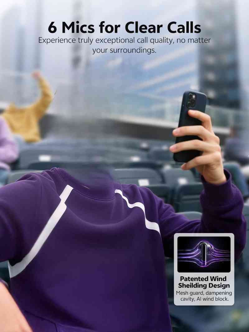 • 6-Mic AI Calls: Equipped with 6 mics, AI noise cancellation, and a wind-resistant algorithm, these wireless earbuds capture your voice and reduce wind noise, ensuring natural, clear calls as if you’re talking face to face.