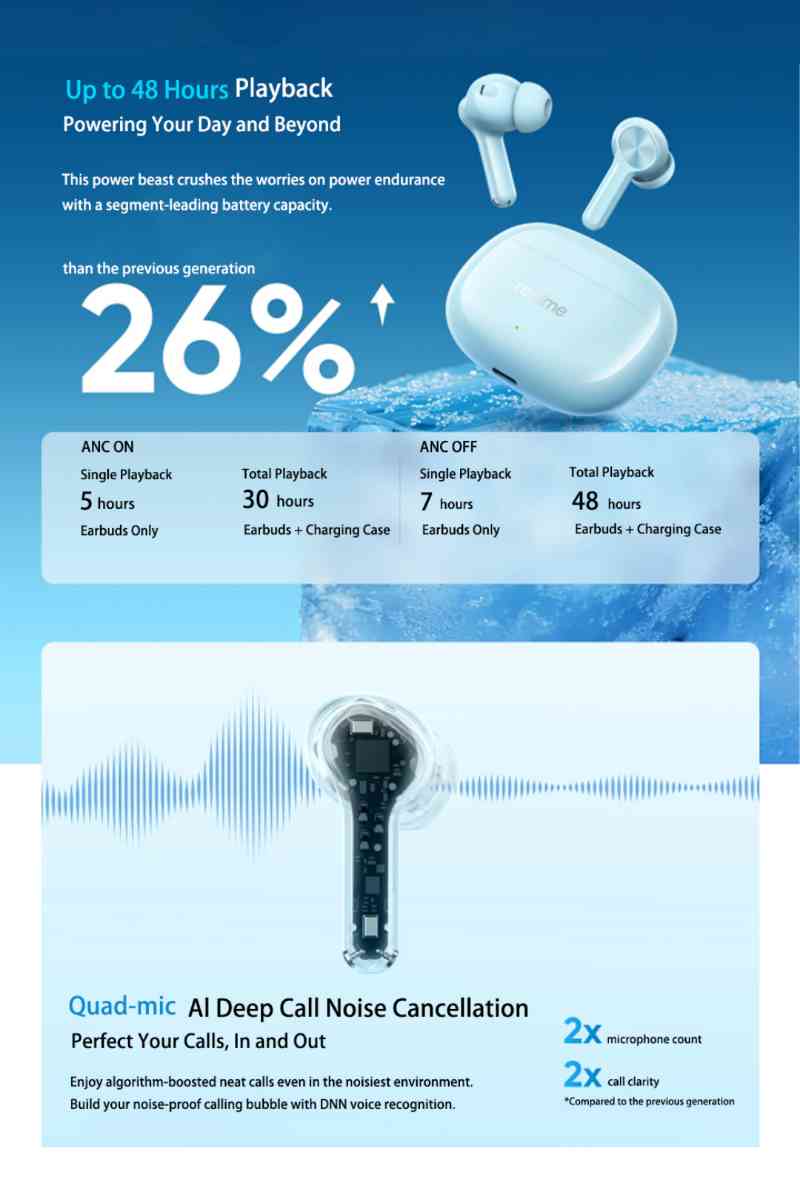 • 25dB Active Noise Cancellation: Crafted for uninterrupted listening, the Realme Buds T200x features up to 25dB Active Noise Cancellation technology that effectively blocks out external disruptions. Whether you’re commuting or working in a noisy environment, immerse fully in your world with the perfect balance of silence and sound clarity.