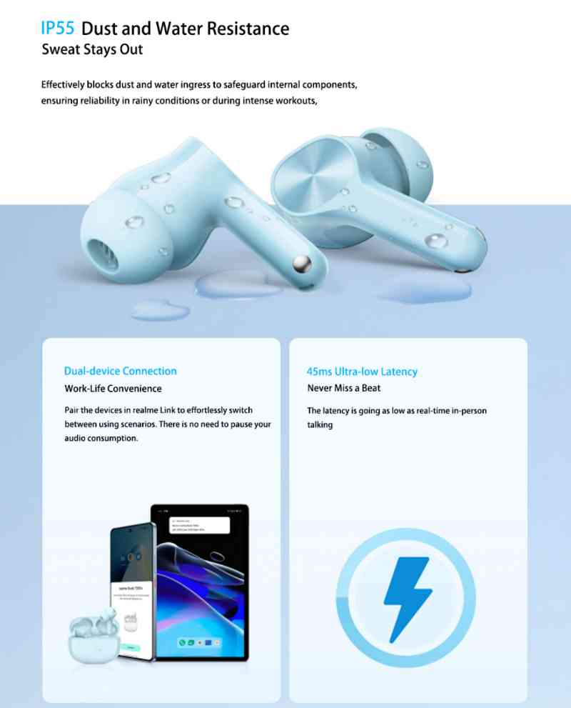 • IP55 Waterproof Rating: Built for outdoor adventures and workouts, the Realme Buds T200x comes with IP55 certification for water and dust resistance. With robust protection, these headphones are enduring against splashes, sweat, and light rain, ensuring longevity for active lifestyles.